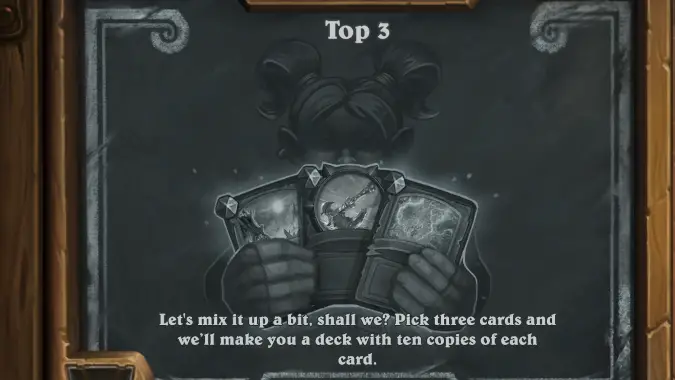 This week in Hearthstone, we have the Top 3 Tavern Brawl, which is like the odd child of the Top 2 Tavern Brawl and Battle of the Bans Tavern Brawls. Like both of its parent Brawls, there’s no random element this week: instead, it’s all about picking three cards that let you pull off some crazy combos.