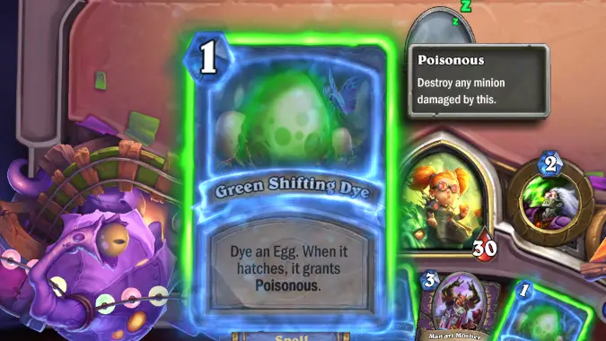 The goal of the game is as expected: to reduce the other hero’s hit points to zero using your spells, minions, and Noblegarden Eggs. Each turn, a Noblegarden Egg lands on your board. It’s a stealthed 0/2 minion, and your Shifting Dye will can buff it in a variety of ways, depending on the dye’s color. A single egg can have multiple dye buffs, assuming you have enough dyes in hand.