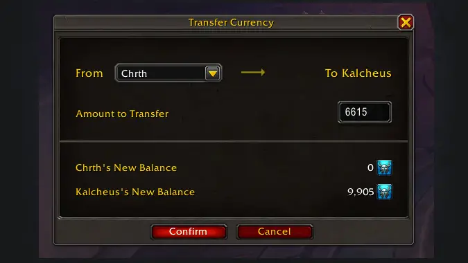 Once you click the Transfer button you’ll see the above interface. You’ll be able to choose any character that has the currency from the list, and you can enter the amount you wish to transfer. Unfortunately there isn’t a “Transfer All” button so you have to type the full amount and press Enter for the confirm button to become available. The bottom of the screen will show the new balances after the transfer is completed, giving you the option to change the transfer amount or to cancel. Once you click Confirm the transfer will complete and the currency will be added to that character’s total. Note that if you have no other characters with that currency available the Transfer option will not be available.
