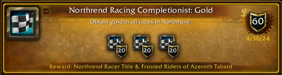 For those who master each race and reach gold with all 36 variants (Normal, Advanced, and Reverse for all 12 races), a special achievement will be awarded. This grants both the Northrend Racer title and a unique tabard with which to show off your racing prowess. Transmog enthusiasts will also love the gold and white Frosted Riders of Azeroth Tabard for its simple elegance and versatility.